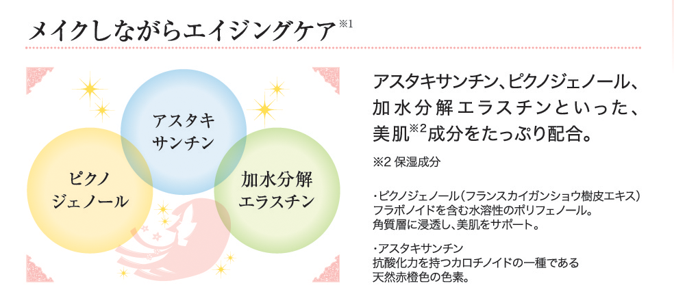 「アクティブプラスBBスキンケアファンデーション」は、肌をただ守るだけでなく、エイジングケア成分をふんだんに配合しています。