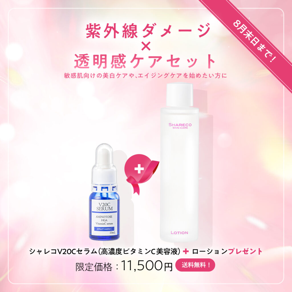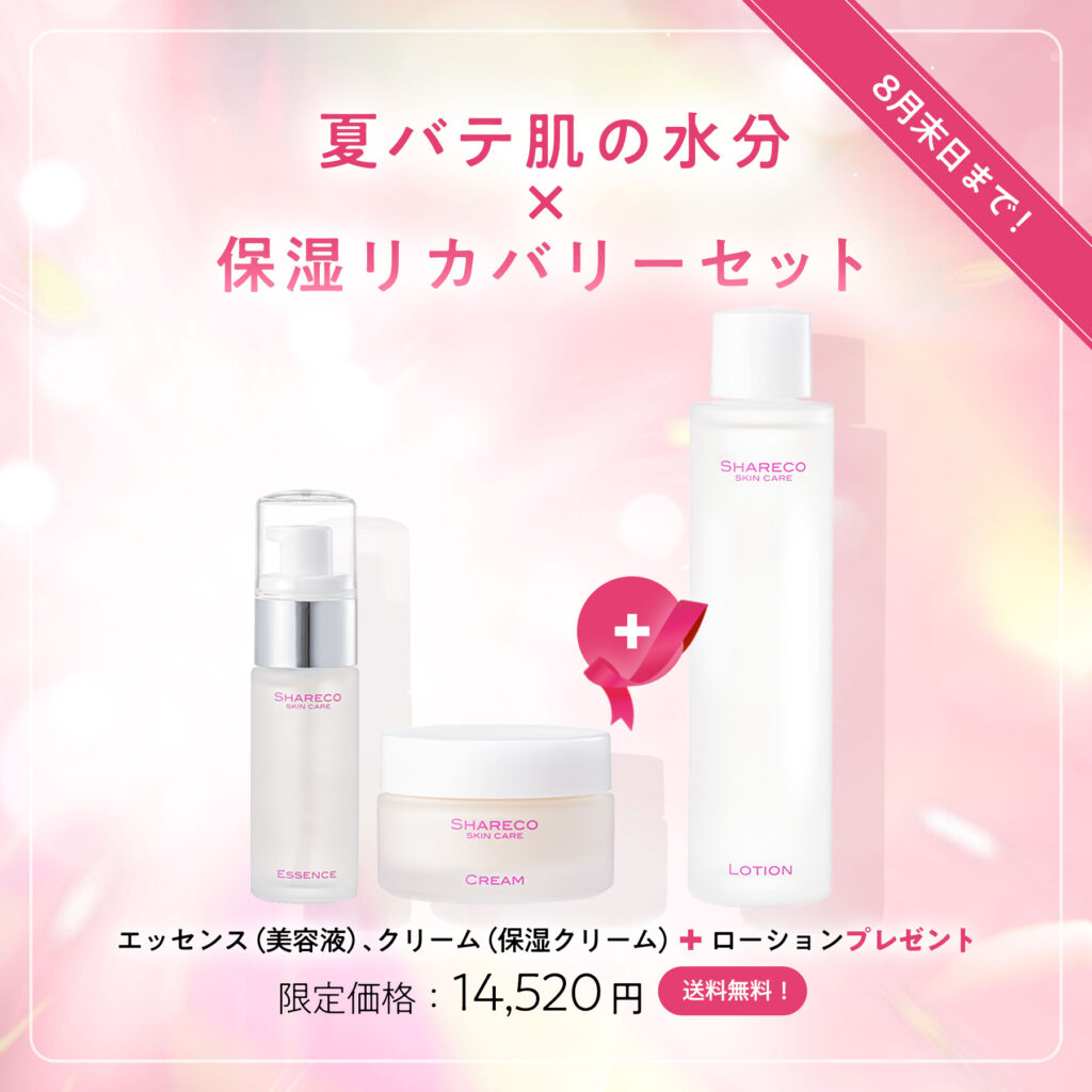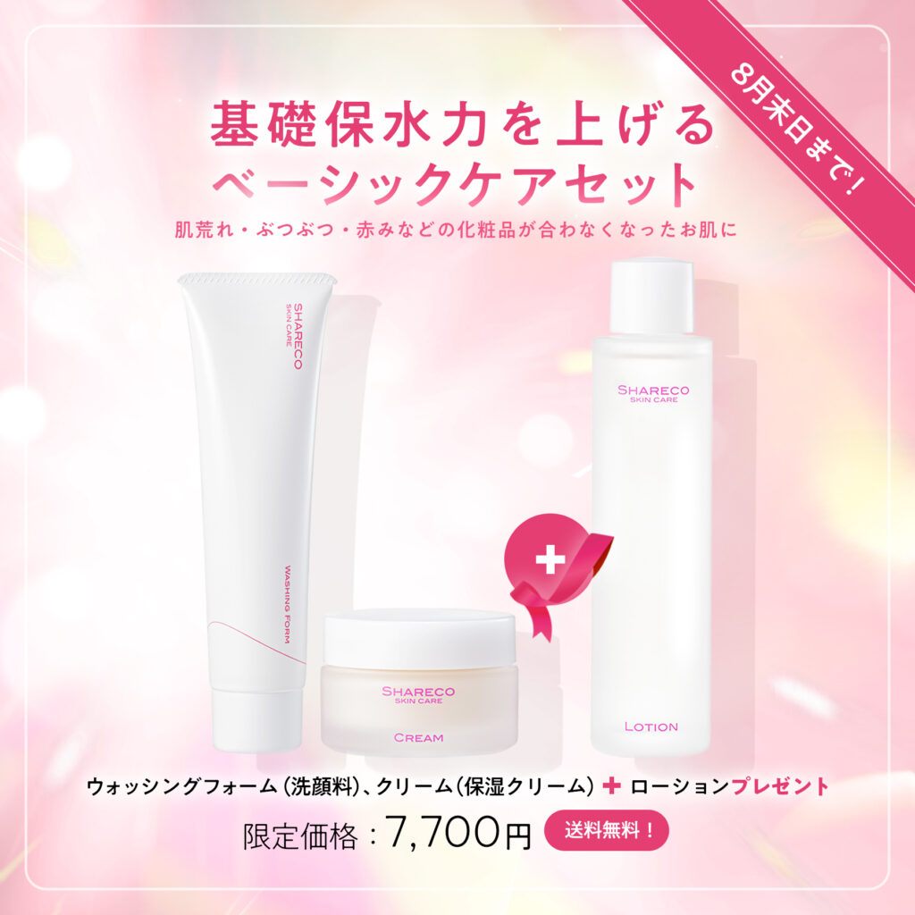 Welcome back ! お久しぶりの方限定キャンペーン対象商品をご購入でシャレコローション(化粧水)本品プレゼント! 【 販売期間:8月31日まで 】 ※こちらのキャンペーンは終了いたしました。ご好評いただき誠にありがとうございました! ▼ 対象商品はこちら ▼ 基礎保水力を上げるベーシックケアセット限定価格:7,700円(税込)【 送料無料 】肌トラブルの根本原因にアプローチ!基礎保水力を上げるベーシックケアセット★紫外線による乾燥、ニキビ・吹き出物・くすみ・ベタつきなどのお悩みに集中ケア! 詳しくはこちら! 紫外線ダメージ × 透明感ケアセット限定価格:11,500 円(税込)【 送料無料 】シミの原因となるメラニンの分解、生成抑制、輸送用書、積抑制によりシミの根本原因にアプローチ!シミに加えハリ・ツヤ・弾力を与えます。 詳しくはこちら! 夏バテ肌の水分×保湿リカバリーセット限定価格:14,520円(税込)【 送料無料 】シミ・小ジワ・くすみ・ハリの低下を改善!「水分補給」「細胞賦活化」「アミノ酸補給」を兼ね備えたセット★跳ね返るような弾力のある美肌へ導きます。 詳しくはこちら! お電話でのご注文(通話料無料)0120-66-4805受付時間 10:00~17:00 (日・月を除く) 注意事項 注意事項 ※対象商品1点ご購入につき、シャレコローション1本をプレゼントいたします。※プレゼント品の転売等、営利目的でのご購入はお控えください。※お電話からのご注文も可能です 公式ショッピングサイトはこちら!
