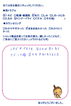シャレコさんの製品を使い始めて一番変わったことは吹き出物ができにくくなったこと、 …